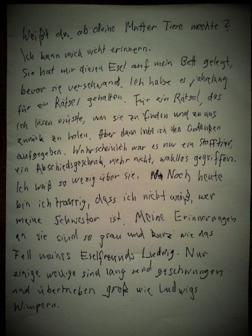 Nebliger Morgen. Streife durch die wild wuchernden Büsche und Sträucher, die seit Jahren keiner mehr stutzt und schneidet. Harte, kleine Äste, die nach mir peitschen, Dornen. Nasses, kniehohes Gras, feuchte Waden. Ziehe meine Schuhe aus, werfe sie Richtung Wohnblock. Längst nicht weit genug. Krähen. Dann der kalte Beton unter den Füßen, hart und rau. Drücke die Haustür auf. Das Treppenhaus müsste man freilegen, alles rauskloppen, bis auf die Stahlträger, entfleischen bis auf das Skelett. Aus Stahldraht Treppen fertigen, durchsichtig und wie schwebend. Ich laufe in den vierten Stock, schließe die Augen, sehe: Wald. Bäume, Äste, Rinde, Sträucher. Die Wände bewachsen mit rankenden, schlingenden Pflanzen, Efeu, Knöterich, auch Blumen. Weicher Boden, Unterholz, federnd, moosig. Bei jedem Schritt das Knacken kleiner Ästchen. Hinter Büschen und in Wipfeln vermutet man ganz automatisch Leben, Bewegung. Aber da ist nichts. Lebendige Leere. Dieser Wald ist nur eine Schicht Wald, zwei Meter fünfzig Deckenhöhe.